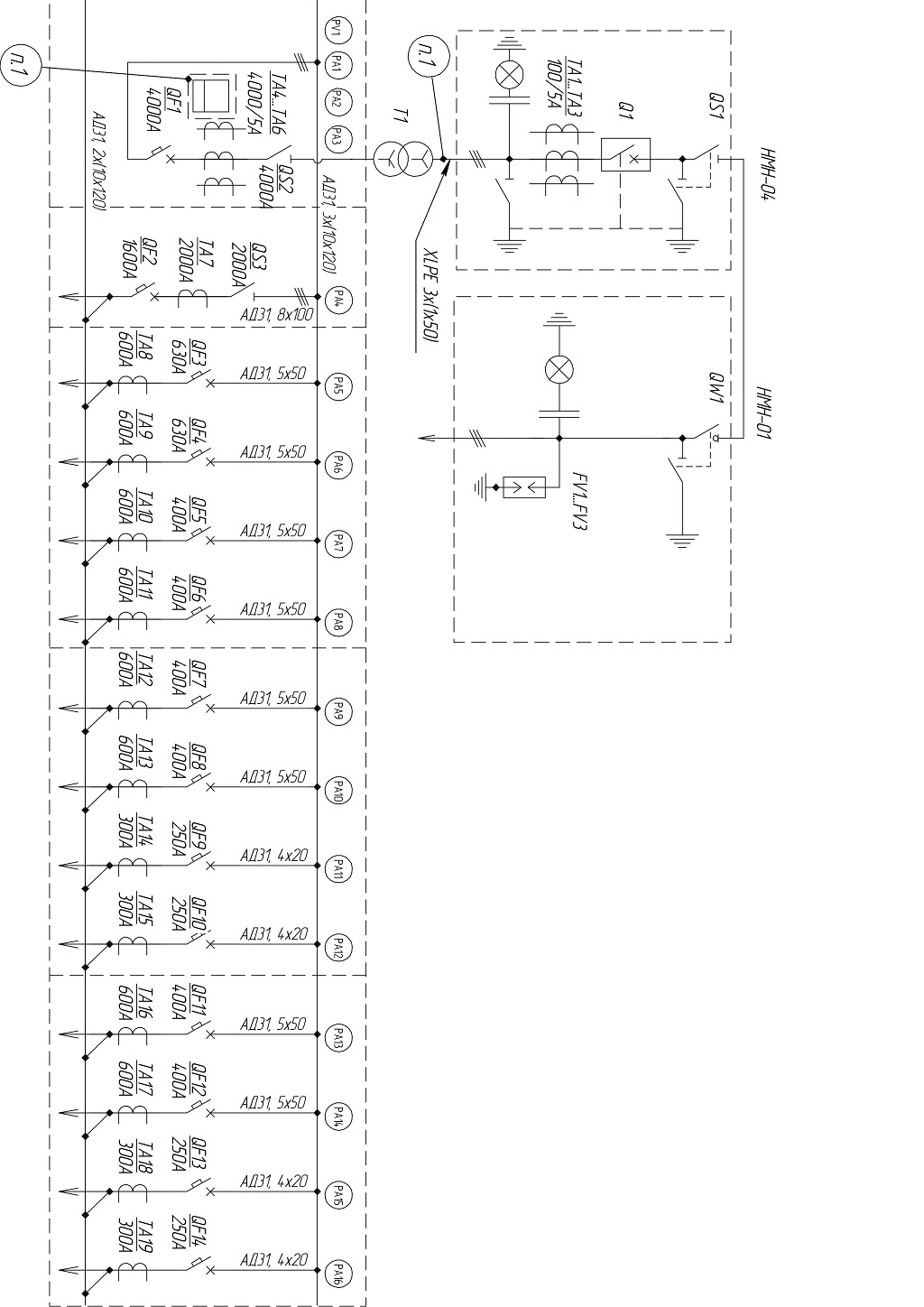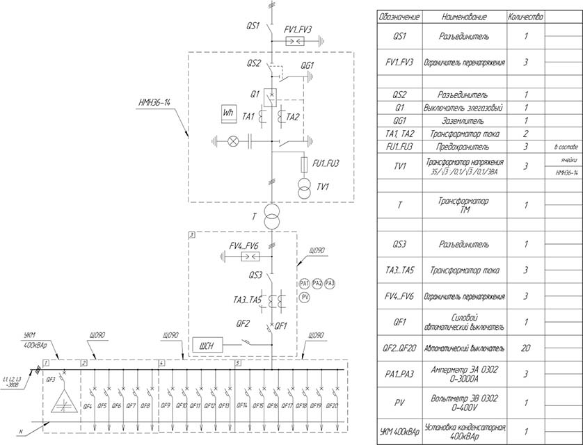 РУ-0,4 кВ комплектуется панелями одностороннего обслуживания серии ЩО90 со стационарно устанавливаемыми автоматическими выключателями либо рубильниками. Распределение электрической энергии по потребителям осуществляется кабелем марок ВВГ, ВБбШв, АВВГ, ААШв, ААБл. Вводы-выводы под кабельные заходы выполняются с уплотнением.