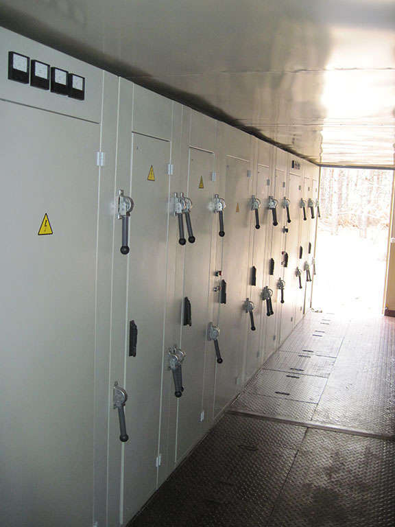 Для панелей с автоматическими выключателями используются силовые выключатели. Производитель выключателя выбирается по желанию Заказчика. Между автоматическими выключателями и сборными шинами установлены разъединители, управляемые штангой. Трансформаторы тока в этих панелях для удобства обслуживания расположены между выключателем и разъединителем. Между вводом и автоматическим выключателем разъединителей нет, так как при ремонте выключателя силовой трансформатор может быть отключен со стороны высшего напряжения. Панели с рубильниками комплектуются рубильниками с предохранителями, или без них.