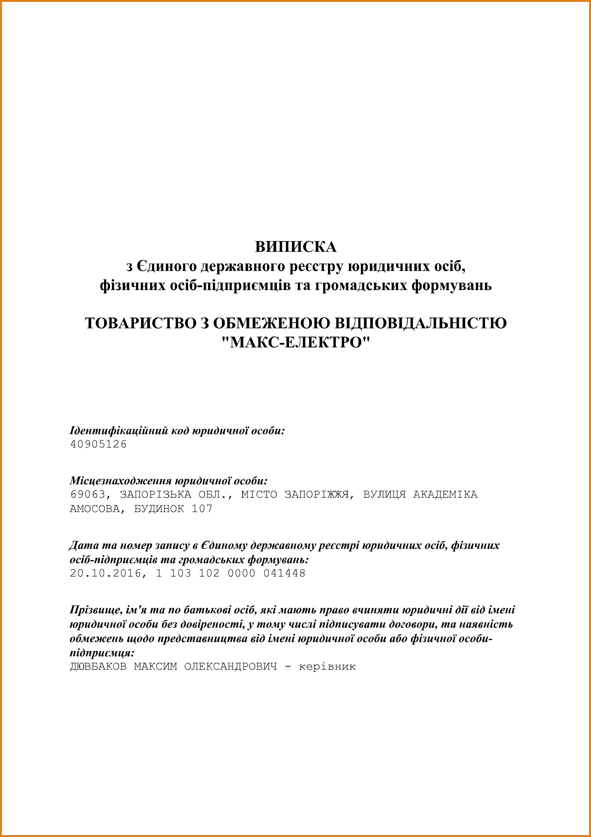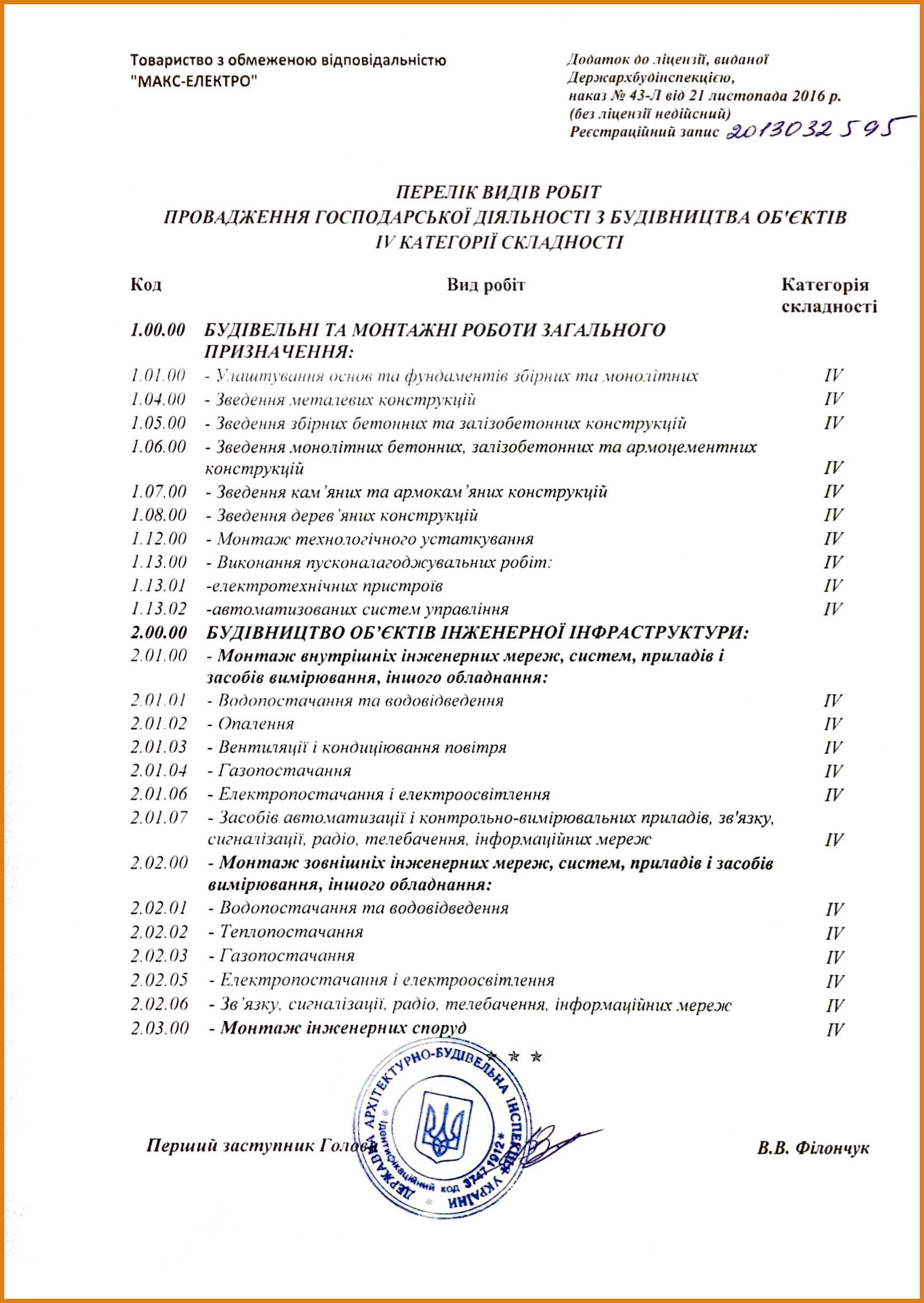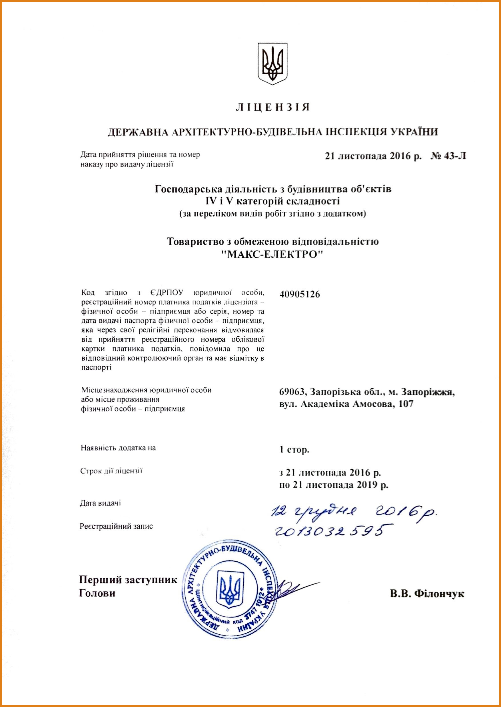 Діяльність компанії ТОВ "Макс-Електро" здійснюється на підставі ліцензії. Всі фахівці мають необхідні документи і допущені до роботи з електроустановками до і понад 1000 В. Наявність кваліфікованих фахівців дозволяє виконувати роботи будь-якої складності.